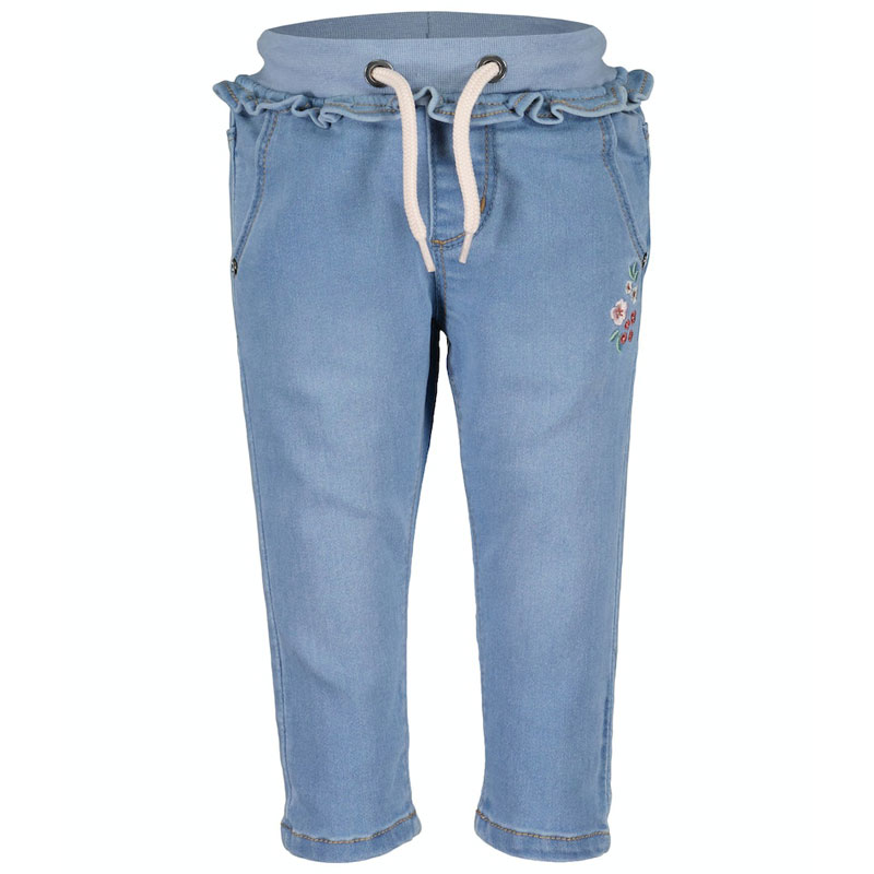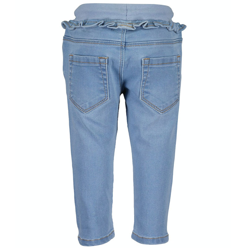 Schattig baby meisjes spijkerbroekje van lichtblauwe stretch denim. De baby jeans van het babykleding merk Blue Seven heeft een tailleboord met elastiek en aansnoerveter. Onder de boord is een lief ruche gezet.