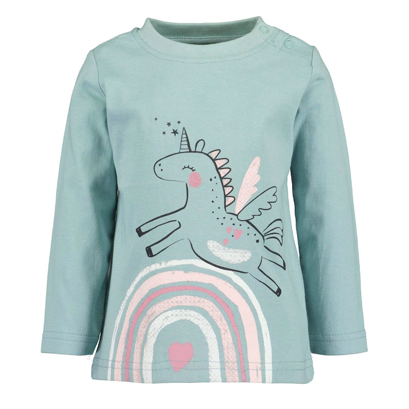 Schattig oud groen baby meisjes t-shirtje met lange mouwtjes van het babykleding merk Blue Seven.