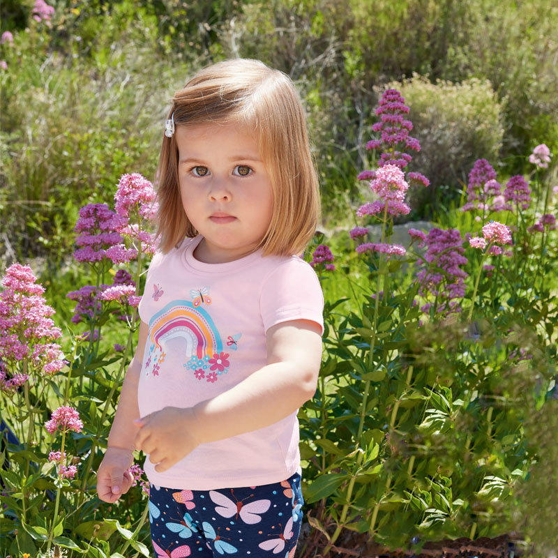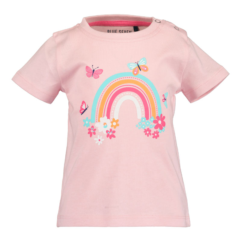Schattig lichtroze meisjes baby t-shirt met korte mouw van het babykleding merk Blue Seven. Het shirtje heeft een vrolijke print van een regenboog met bloemen en vlinders.