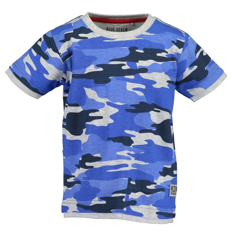 Gaaf blauw camouflage jongens shirt met korte mouwen uit de serie Xtreme Cars van het kinderkleding merk Blue Seven.