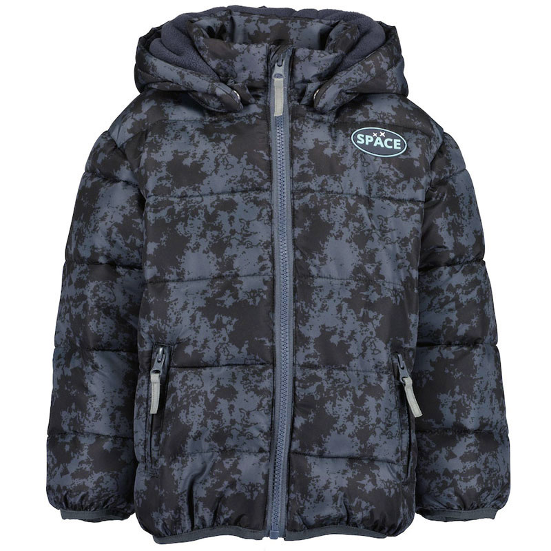 Trendy en comfortabel donkergrijs jongens winterjas met camouflage print van Blue Seven. De warm gewatteerde jas is horizontaal doorgestikt en gevoerd met donkergrijze fleece.