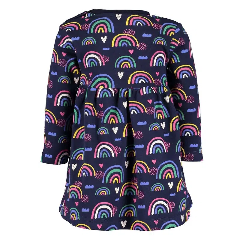 Lief donkerblauw meisjes baby jurkje met lange mouwen van het babykleding merk Blue Seven. De jurk van super zacht tricot en heeft een kleurrijke all-over print van regenbogen en hartjes.