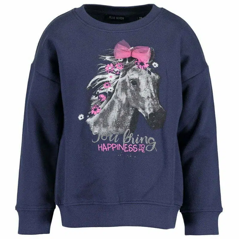Mooie donkerblauwe meiden sweattrui van het kinderkleding merk Blue Seven. Het sweatshirt heeft een leuke print van een paardenhoofd met een roze tule strikje en bloemetjes in de manen. Onder de print gedeeltelijk met glitterletters de tekst “You Bring Happiness to me”.