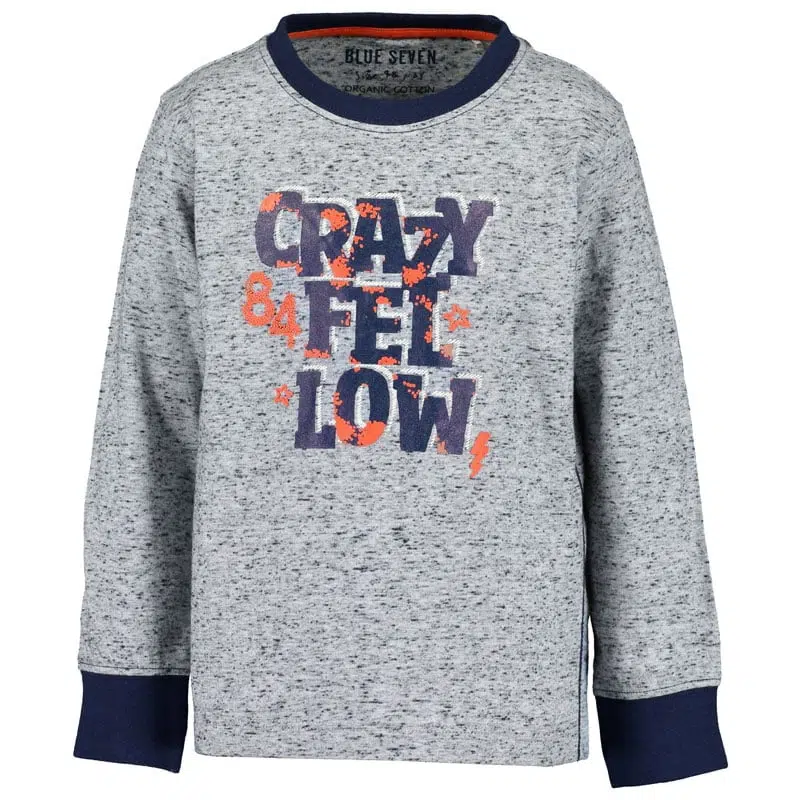 Gaaf gemêleerd jongens shirt met lange mouw van het kinderkleding merk Blue Seven. Het grijze shirt met donkerblauwe spikkels heeft een stoere uitstraling door de donkerblauwe boordjes langs de hals en aan de mouwen. Middenvoor is nog een coole donkerblauwe tekst print met oranje accenten “CRAZY FELLOW” geplaatst.