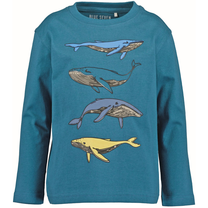 Gaaf petrol kleurig jongens shirt van het kinderkleding merk Blue Seven. De longsleeve uit de serie Iceland heeft een coole print van vier walvissen. De afbeeldingen van de walvissen liggen op het tricot.