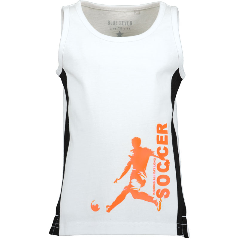 Sportief wit jongens singlet van het kinderkleding merk Blue Seven. Op de voorkant heeft het mouwloze shirt een coole rubberen print van een voetballer met daarbij de tekst “kicking allday long SOCCER”.