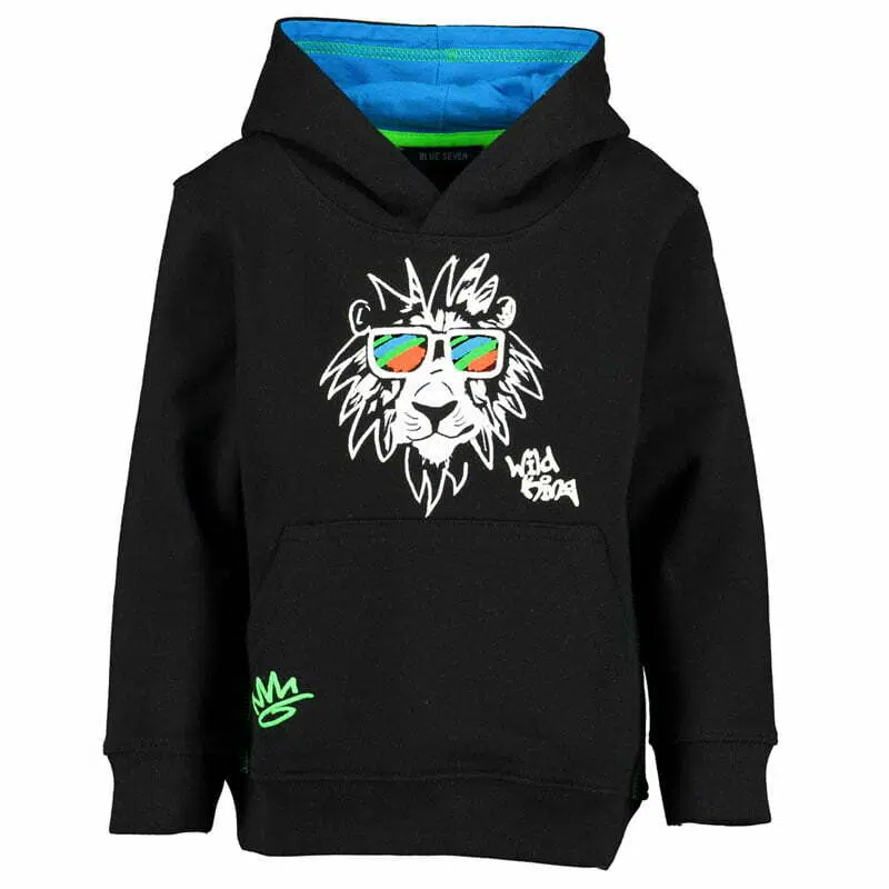 Gave jongens sweater met capuchon en kangoeroezak van het jongenskleding merk Blue Seven. De jongens sweattrui uit de serie Wild King is gemaakt van comfortabel zachte zwarte sweatstof. De sweater heeft middenvoor een stoere graffiti print van een leeuw met een zonnebril.