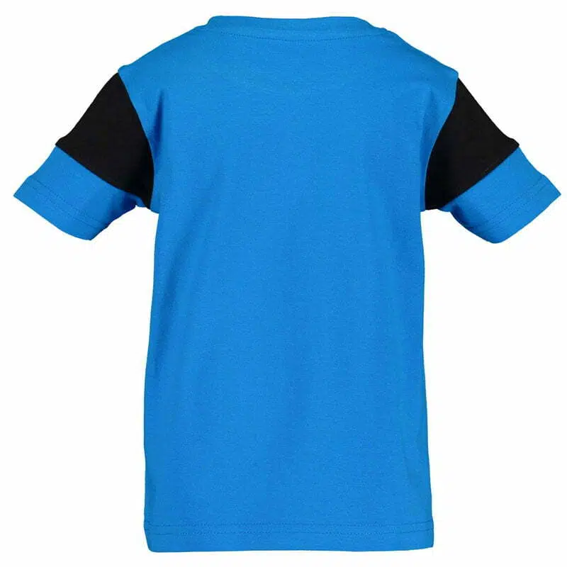 Cool blauw jongens shirt met korte mouwen van het kinderkleding merk Blue Seven. Het t shirt voor jongens heeft een gave print van een leeuwenkop die een felgekleurde zonnebril op heeft.