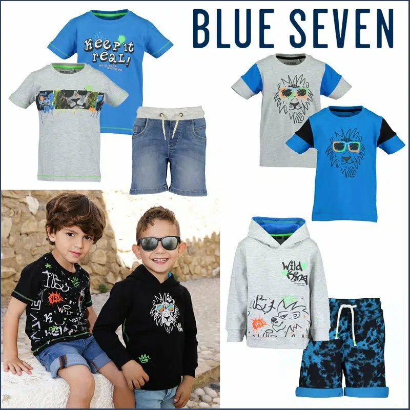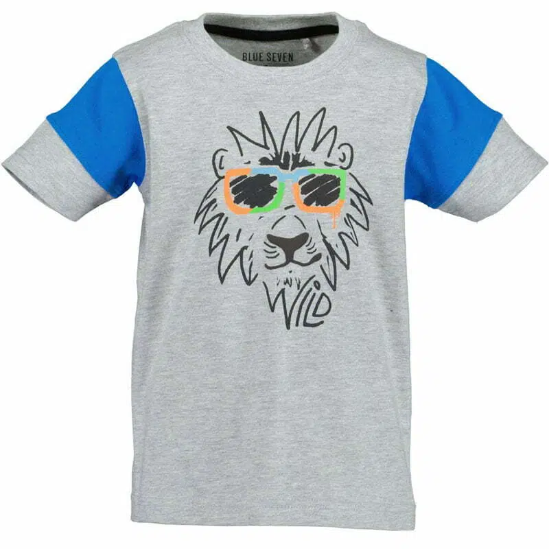 Cool grijs gemeleerd jongens shirt met korte mouwen van het kinderkleding merk Blue Seven. Het t shirt voor jongens heeft een gave print van een leeuwenkop die een felgekleurde zonnebril op heeft.