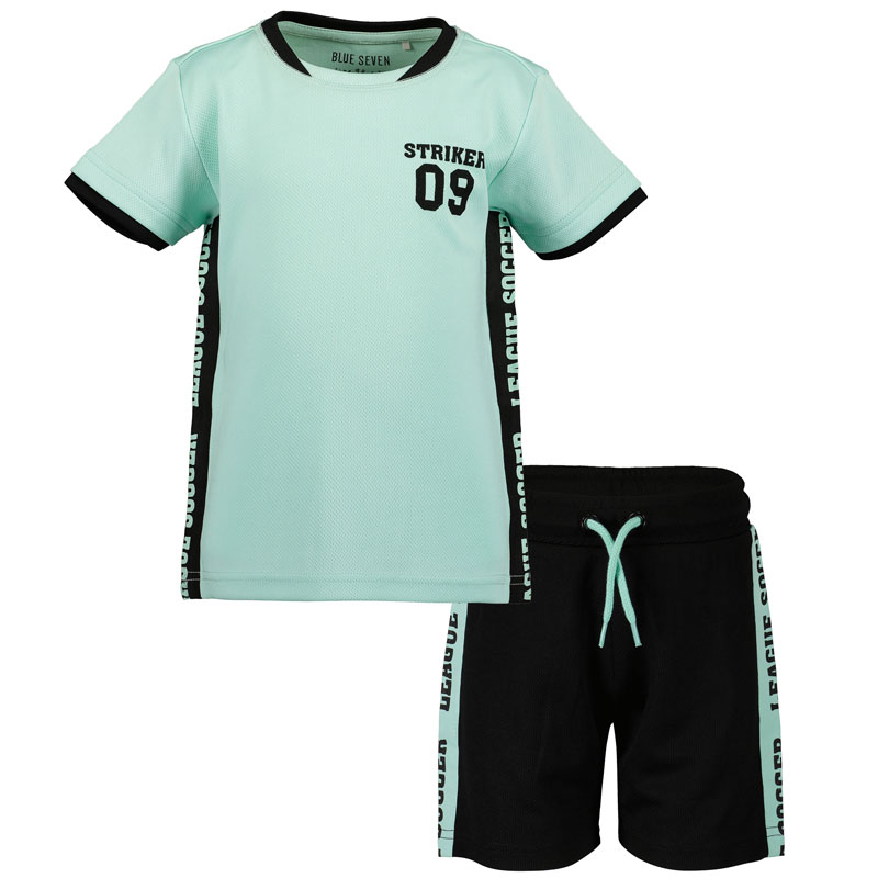 Sportief kinderkleding setje van het merk Blue Seven. De set bestaat uit een een mintgroen shirtje met korte mouwen en een zwart kort broekje.