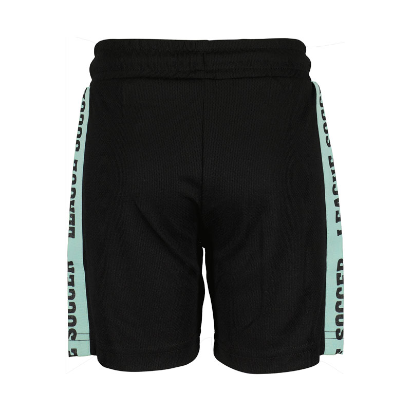 Het zwarte broekje heeft een tailleband met elastiek en een mintgroene aansnoerveter. Over de zijnaden van het broekje is stoer mintgroen band geplaatst met de tekst “soccer leage”.