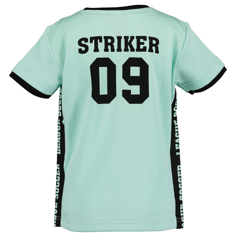 Het kindershirt heeft stoer zwart band met de tekst “soccer leage” over de zijnaden. Aan de voorzijde is op de linkerborst een printje met het cijfer 09 en de tekst “striker” geplaatst. Op de achterkant is in het groot het cijfer 09 en de tekst “soccer” geprint.