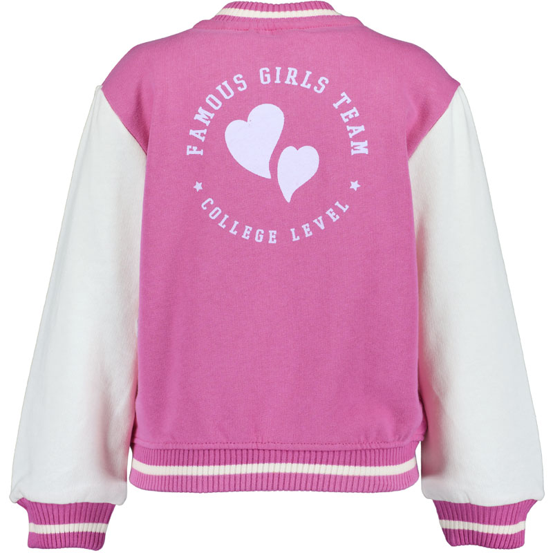Trendy meisjes baseball vest van het kinderkleding merk Blue Seven. Het fuchsia kleurige vest van zachte sweatstof heeft aan de voorzijde een stoere badstof batch van de hoofdletter M.