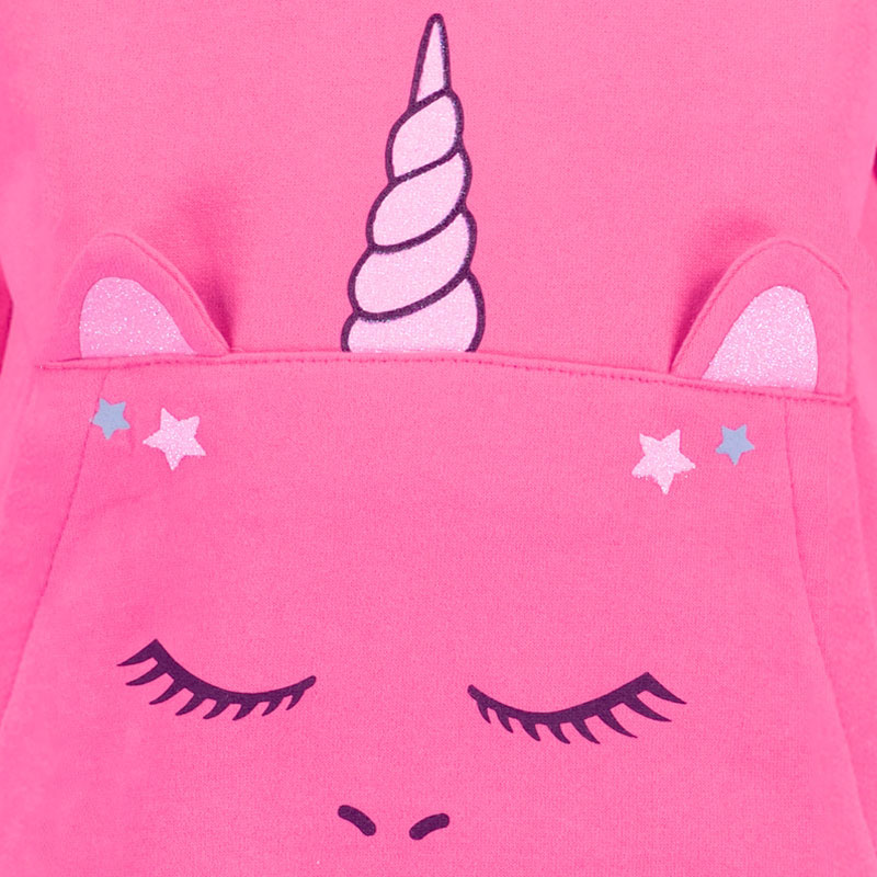 Gave fuchsia meisjes sweater met capuchon van het kinderkleding merk Blue Seven. De trui is gemaakt van super zachte sweatstof. Op het voorpand is een kangaroezak aangebracht met een schattige print van een éénhoorn. De zak stelt hierbij het hoofd van een éénhoorn voor. Grappig detail zijn de oren die uit de bovennaad van de zak steken. De oren , hoorn en sterretjes in de print zijn bedrukt met glitterverf.