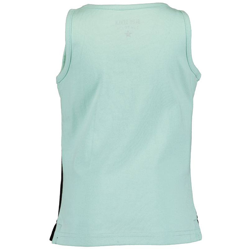 Sportief mintgroen mouwloos jongensshirt van het kinderkleding merk Blue Seven. Op de voorkant heeft het singlet een coole print van een voetbal in het net met daarbij de tekst “KICK IT”.