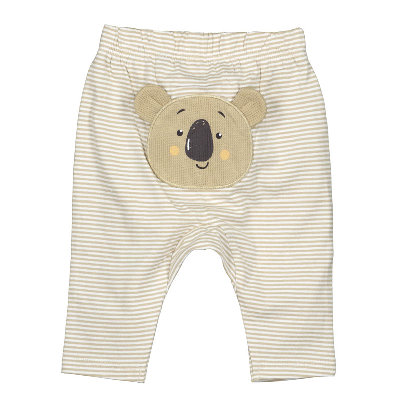 Comfortabel unisex newborn broekje van het babykleding merk Blue Seven. Het broekje is gemaakt van zacht wit met lichtbruin gestreept tricot. Op de achterkant van het babybroekje is een leuke applicatie van een koala aangebracht.