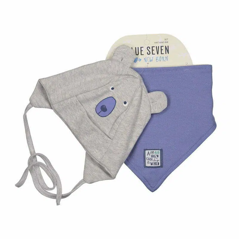 Schattig jongens babymutsje met een berengezichtje en een slabbetje van het babykleding merk Blue Seven. De muts is gemaakt van lichtgrijs gemêleerd tricot en de slab van blauw tricot. Het mutsje en slabje staan erg lief bij een pasgeboren jongetje. De slab staat ook heel stoer als “sjaaltje”.