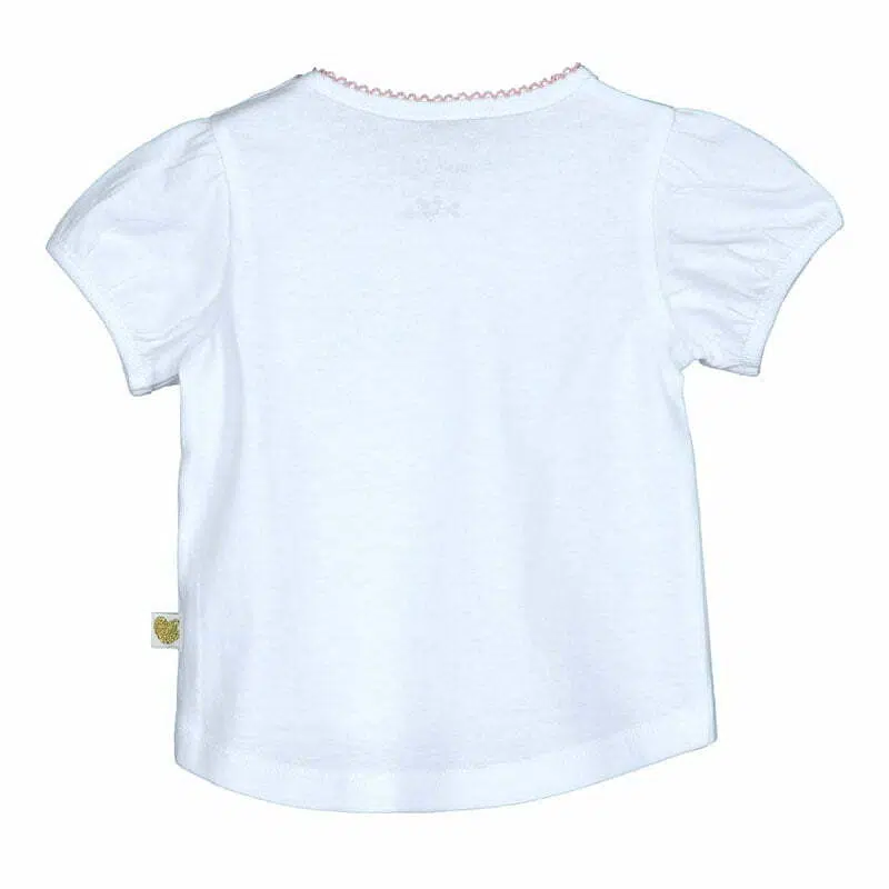 Schattig wit newborn shirtje voor meisjes van het babykleding merk Blue Seven. Het shirtje met korte pof mouwtjes heeft een lief printje van een slapende leeuwen/kattenkop.