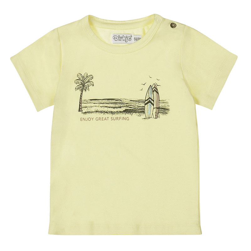 Zomers zachtgeel Dirkje jongens shirtje met korte mouwtjes. Het jongens T-shirt is gemaakt van comfortabel zacht katoenen tricot. Dit leuke shirt heeft een coole print van een strand aan zee met een palmboom en surfboards. Onder de print de tekst “enjoy great surfing”.