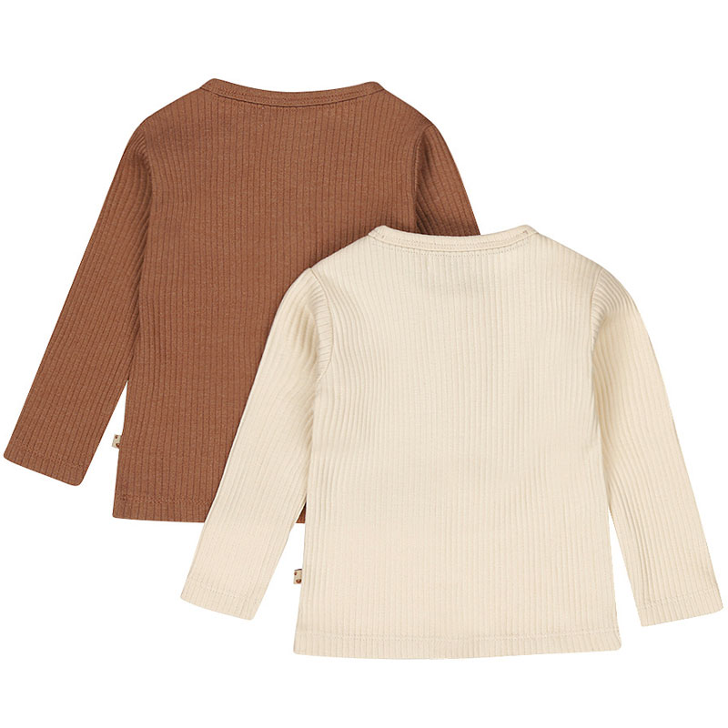 Handig 2 pack met stoere jongens shirtjes van het merk Dirkje. De set met 2 babyshirts bestaat uit een bruin en een créme shirt met lange mouwen. De shirtjes zijn gemaakt van een zacht katoen met stretch, heerlijk comfortabel.