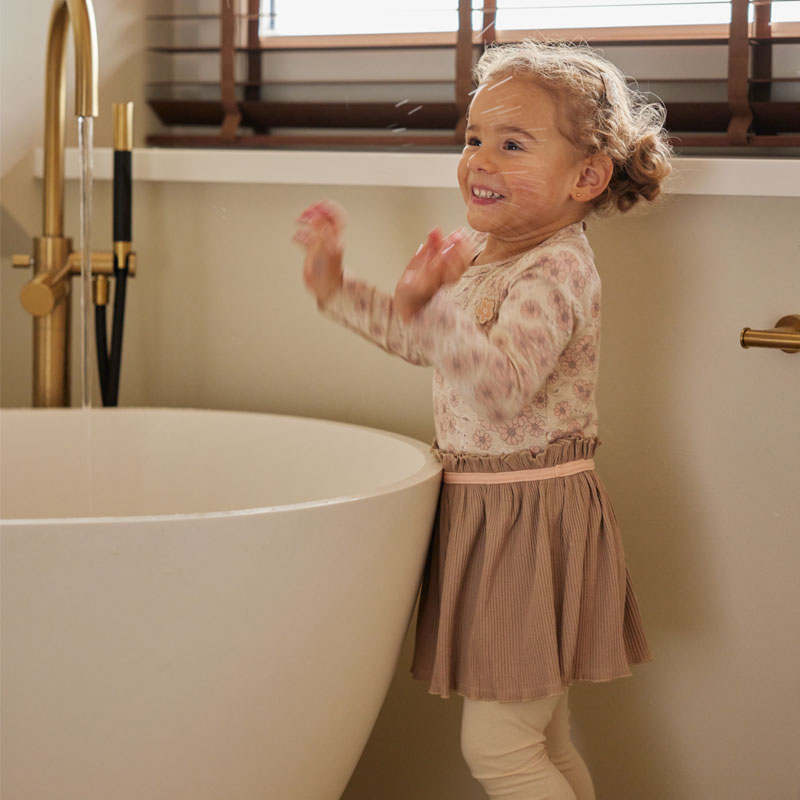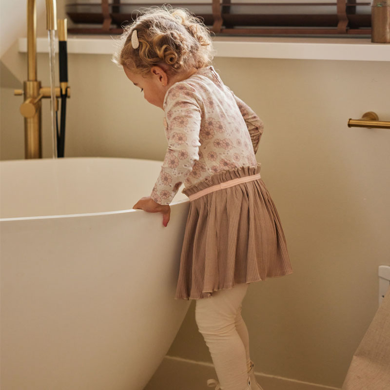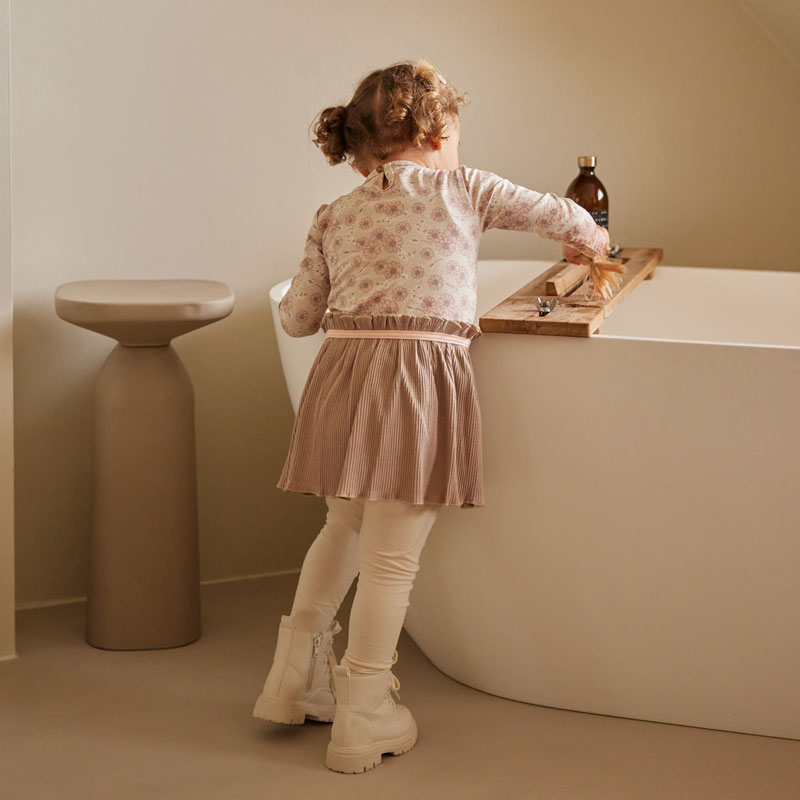 – Het meisjes jurkje heeft en rond halsje en in de kleine maatjes t/m 86 is een drukknoopsluiting op het linker schoudertje geplaatst.