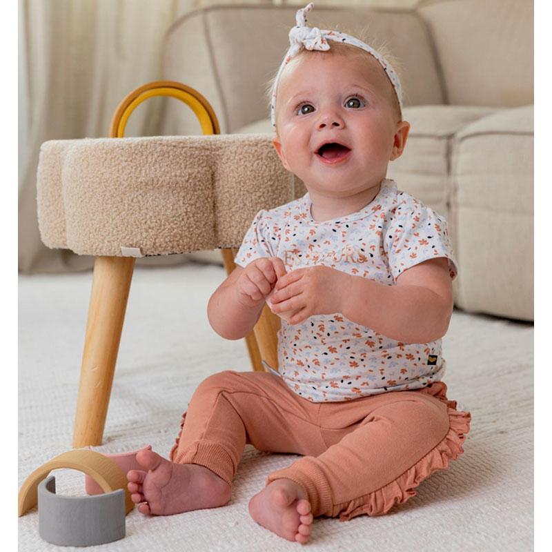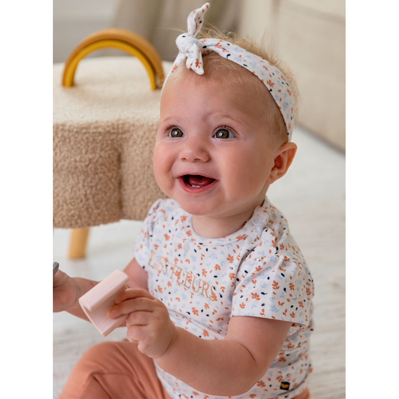 Een lief Dirkje meisjes shirtje met korte mouw en een bijpassend haarbandje. Het t shirt is gemaakt van zacht wit tricot met een schattig all-over printje van bruine en lichtblauwe blaadjes. Middenvoor is een leuk tekst printje “LES FLEURS” geplaatst.