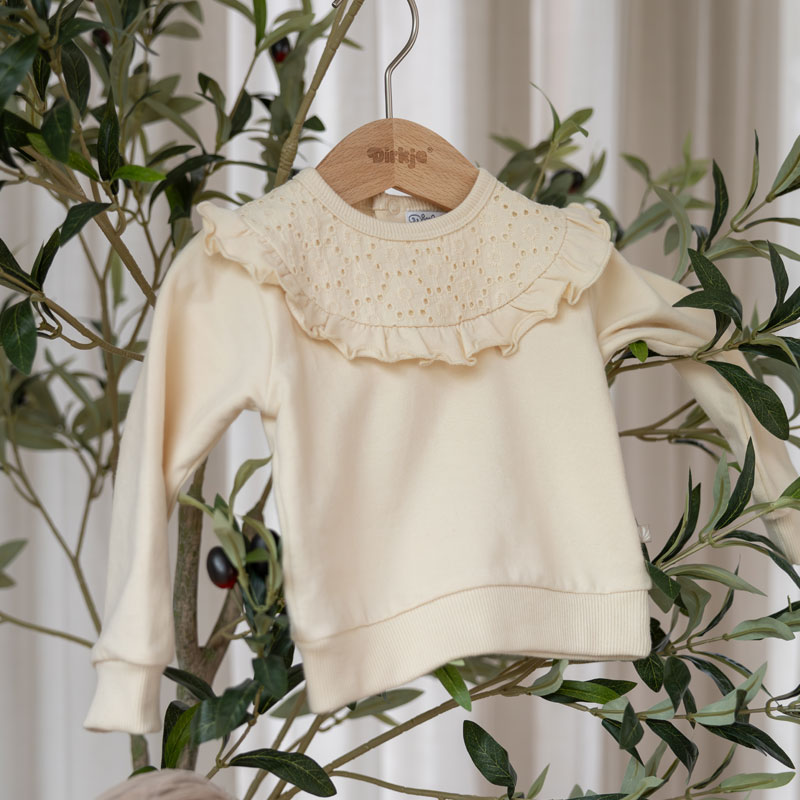 Mooie crème kleurige meisjes sweater van het merk Dirkje. De sweattrui is gemaakt van zachte en soepele sweatstof met stretch wat het truitje lekker comfortabel maakt voor je kleine meid.