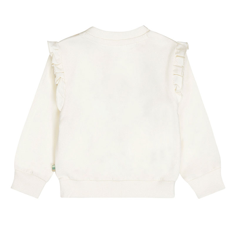 - Design: De sweattrui heeft een klassieke ronde hals met ribboorde. In de kleine maatjes is een handige drukknoopsluiting op de schouder aangebracht voor makkelijk aan- en uittrekken. De mooie libelle-print met subtiele tule-afwerking en de schattige ruches over de schouders geven het geheel een stylvolle uitstraling. De geribde boorden onderaan de mouwen en de onderkant maken de sweater af.