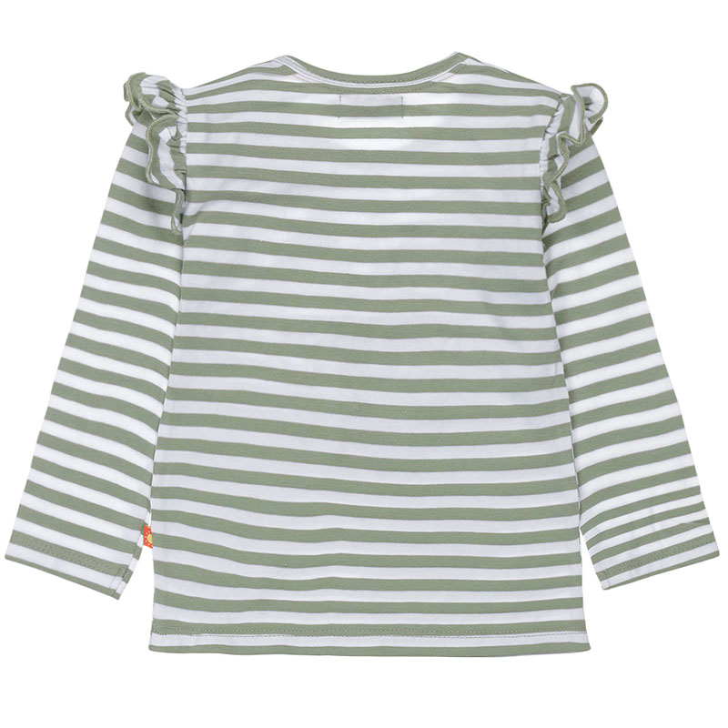Schattig gestreept meisjesshirtje met lange mouw van het babykleding merk Dirkje. Het shirtje met wit groene streepjes heeft lieve ruches langs de mouwinzet. Op de voorkant is een mooie tekst print “GOOD MOOD” geplaatst. Hierbij is voor de letters gebruik gemaakt van verschillende materialen (foam, geborduurd, pailletten, foil enz.) en kleuren. Eén van de letters O in mood is vervangen door een hartje.