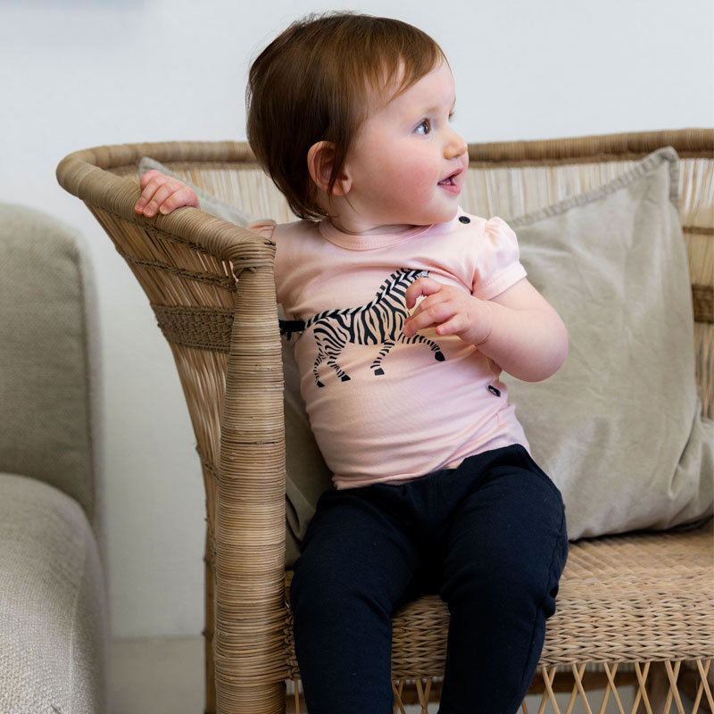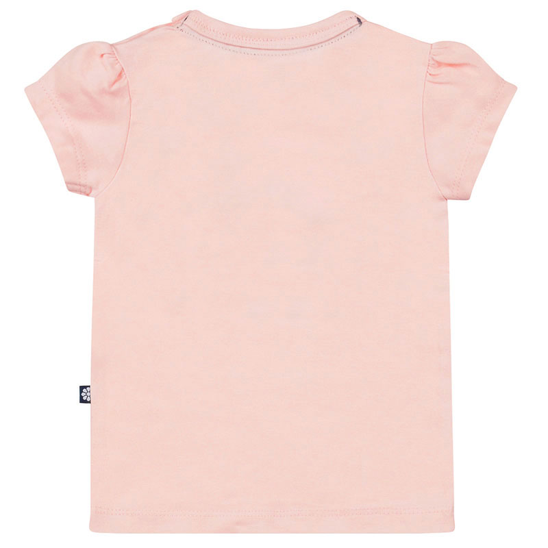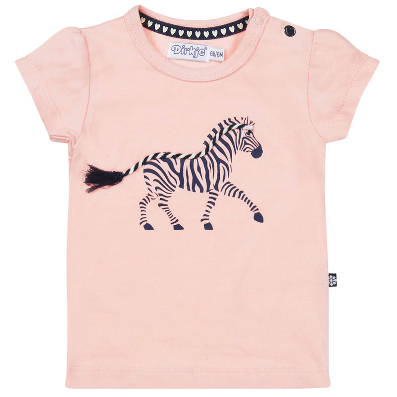 Een schattig Dirkje meisjesshirtje met kleine pofmouwtjes. Het t shirt is gemaakt van zacht lichtroze tricot. Middenvoor is een leuke print van een zebra geplaatst. Over de rug en nek van de zebra ligt een gevlochten koord. Aan het uiteinde is het koord uitgeplozen en doet het dienst als staart.