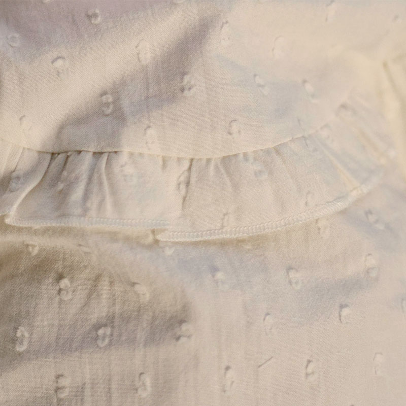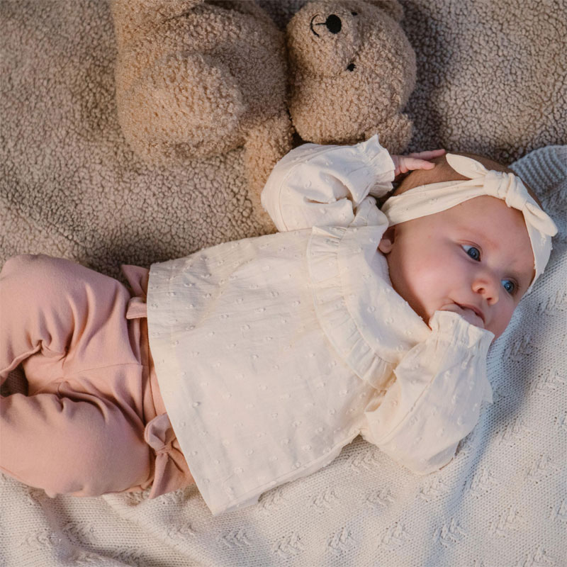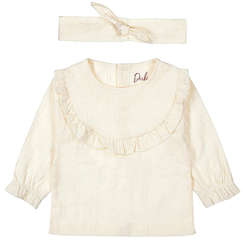 Schattige newborn meisjes blouse met lange mouw van het babykleding merk Dirkje. De baby blouse uit de NOOS collectie van Dirkje is gemaakt van zacht biologisch katoen. De ingeweven stip maakt deze créme blouse extra mooi.