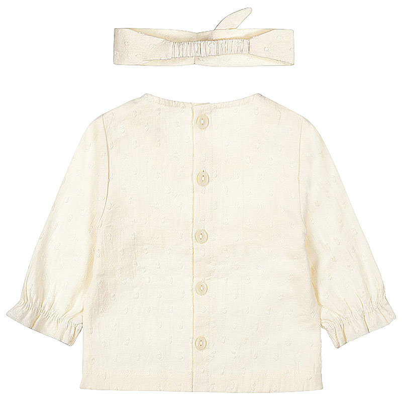 Het bijpassende haarbandje met strikje maakt de blouse helemaal af.