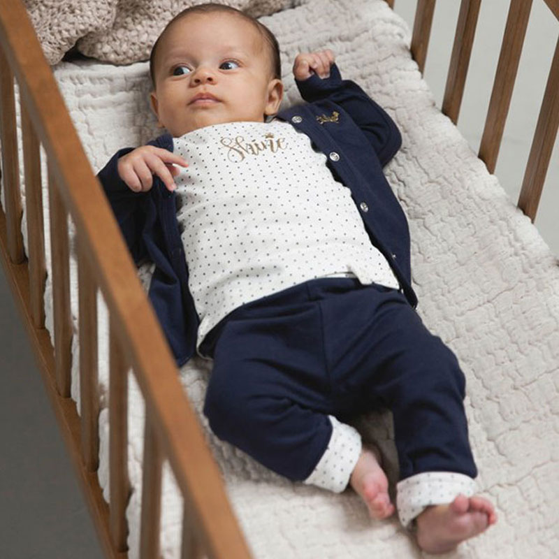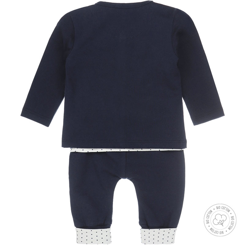 Het setje bestaat uit een donkerblauw broekje en vestje met een off-white gestipt shirtje.