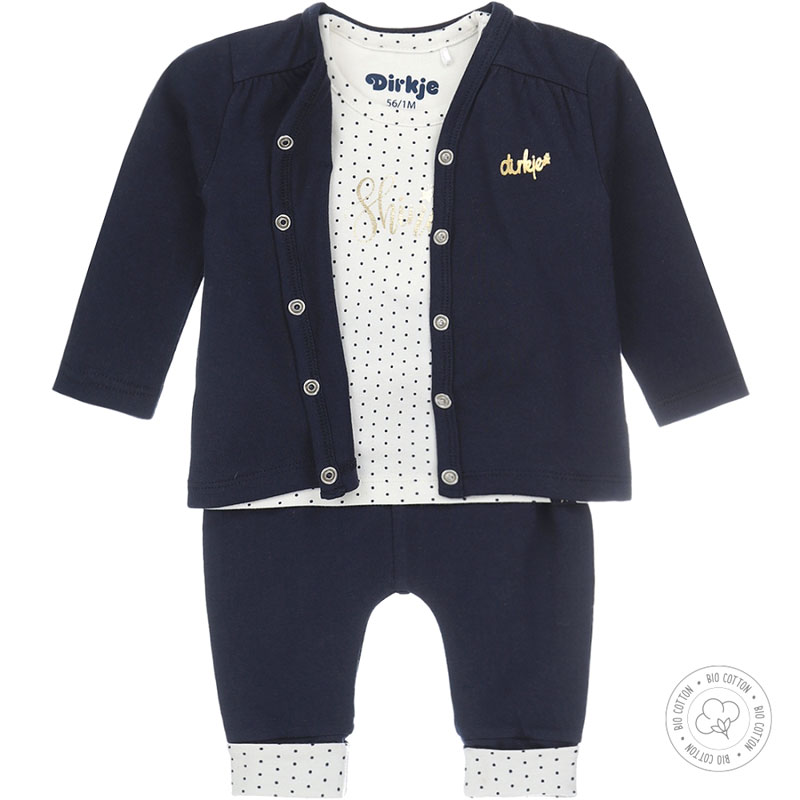 Schattig newborn meisjes kledingsetje bestaande uit een broekje, shirtje en vestje van het babykleding merk Dirkje Newborn. Het 3 delige baby pakje uit de NOOS collectie van Dirkje is gemaakt van zacht biologisch katoen.