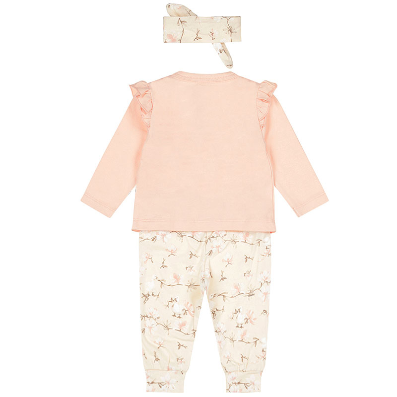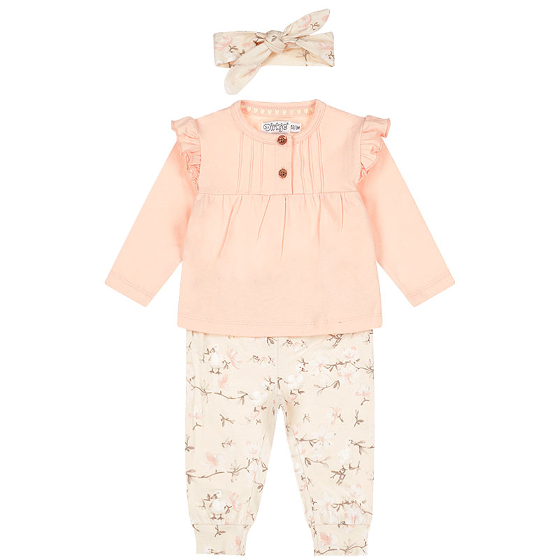 Gemaakt met liefde dit schattige tweedelige meisjes baby setje met haarbandje van Dirkje. De set bestaat uit een zalmroze shirtje en een broekje van zacht crème kleurig tricot.