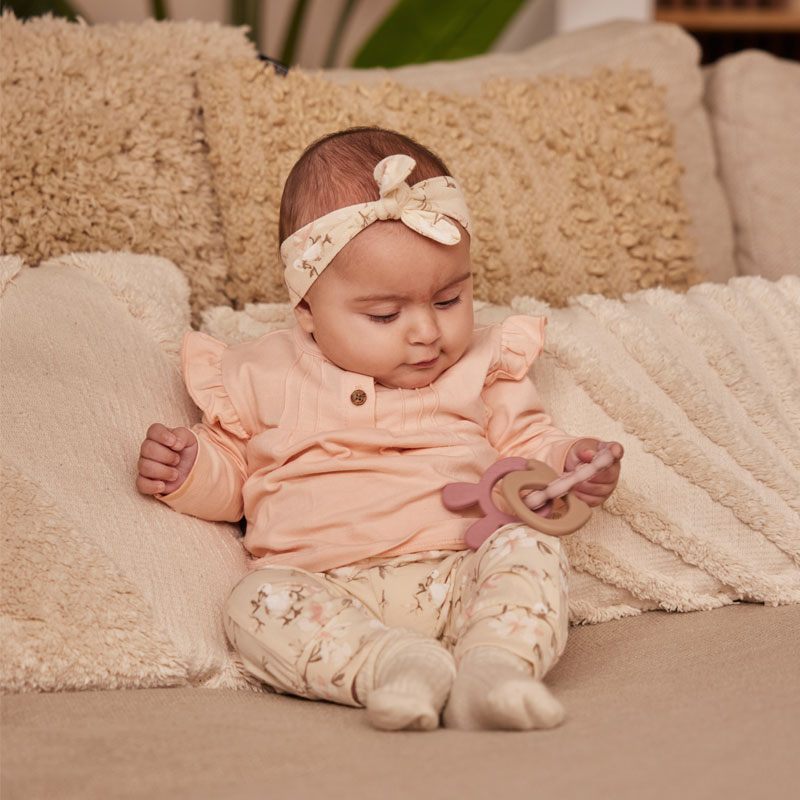 Bij het meisjes baby setje hoort een lief haarbandje van dezelfde stof als het broekje.