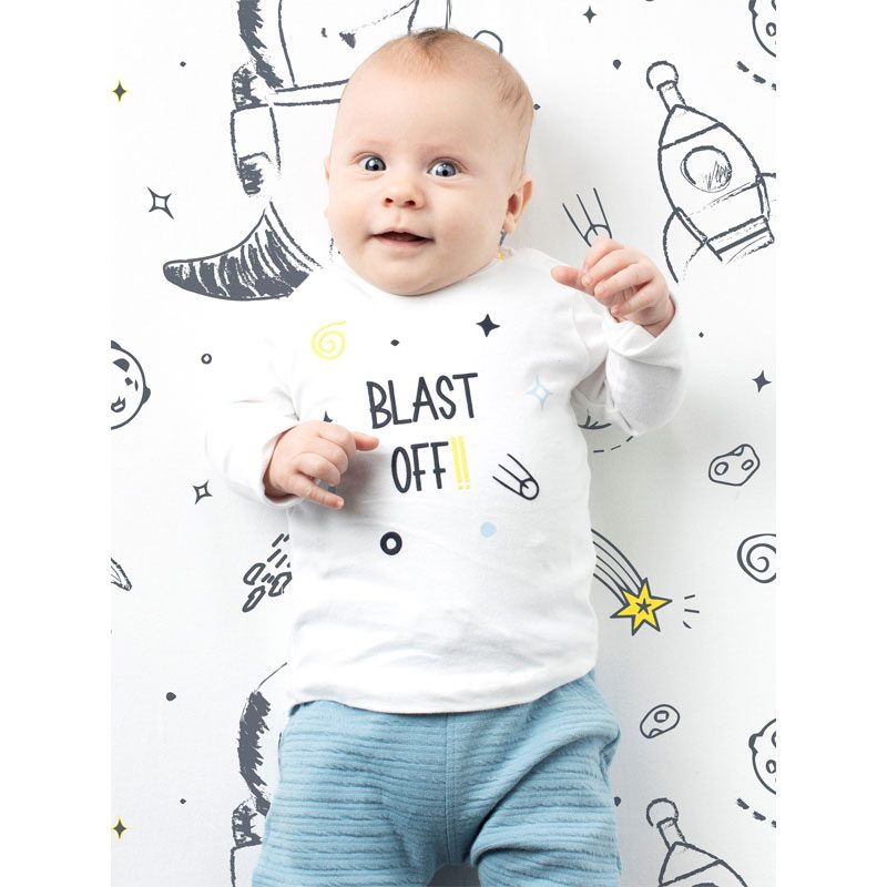 Schattig jongens baby t-shirt van het babykleding merk Quapi Newborn. Het babyshirt is gemaakt van zacht wit tricot. Middenvoor heeft het shirt een grappig tekst printje “BLAST OFf”.
